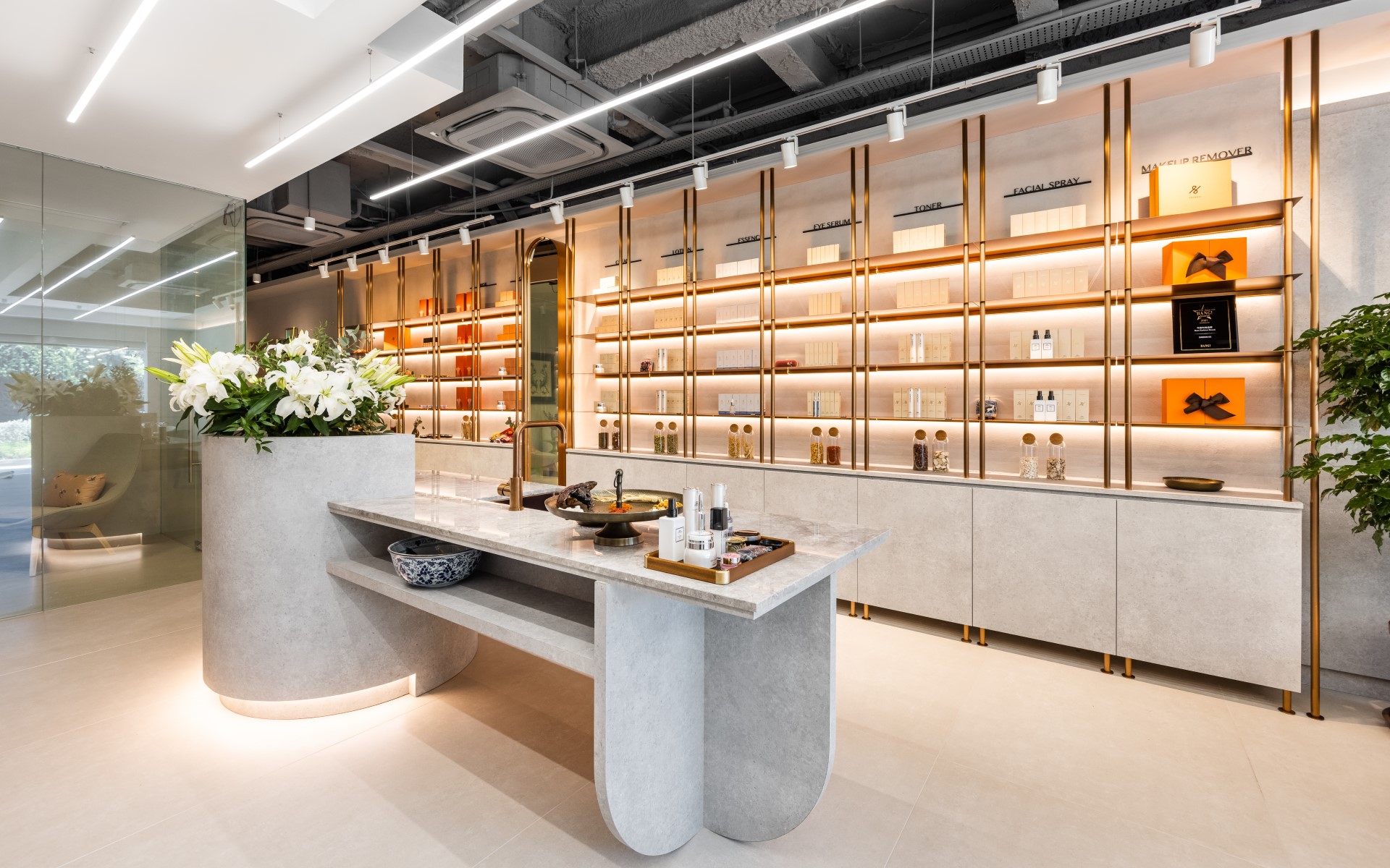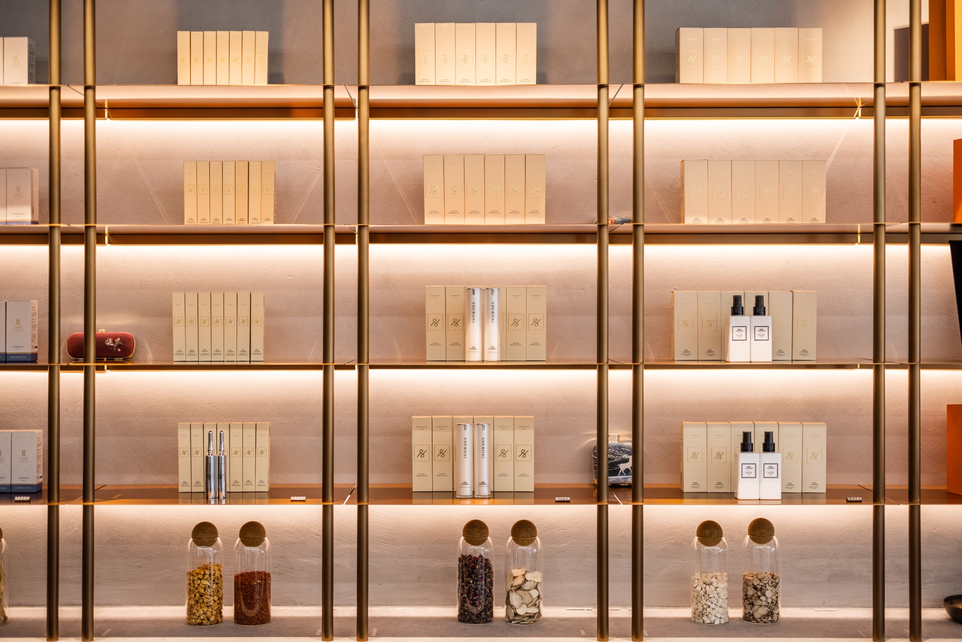 A central feature counter displaying traditional natural herbs showcases how Sheroxi marries the best of both Eastern and Western ideologies through modern technologies to meet today’s skincare needs.